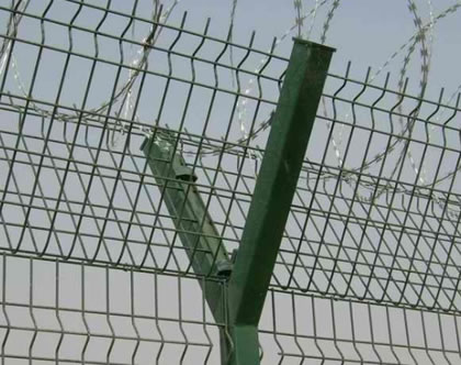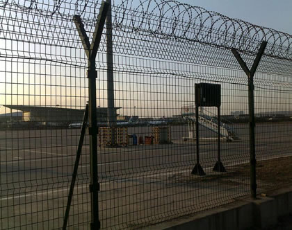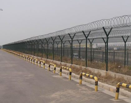 機(jī)場(chǎng)護(hù)欄網(wǎng)又稱作“Y型安全防御護(hù)網(wǎng)”,是由V型支架立柱,加強(qiáng)型焊接片網(wǎng),安全防盜連接件和熱鍍鋅刀片刺籠組成強(qiáng)度和安全防御性級(jí)別很高。近年來,被廣泛應(yīng)用在機(jī)場(chǎng),軍事基地等高安全場(chǎng)所。注:如果在機(jī)場(chǎng)護(hù)欄網(wǎng)頂部加裝刀片刺絲、刀片刺繩后又很好的增強(qiáng)了安全防護(hù)性能。