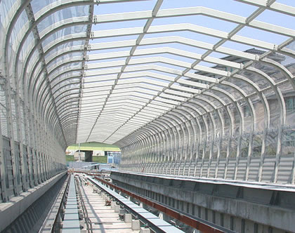 7、美觀可塑:根據(jù)不同需要可采用與金屬材料及透光材料組合的結(jié)構(gòu)形式,也可噴涂各種色彩及圖案,以達到景觀裝飾要求。